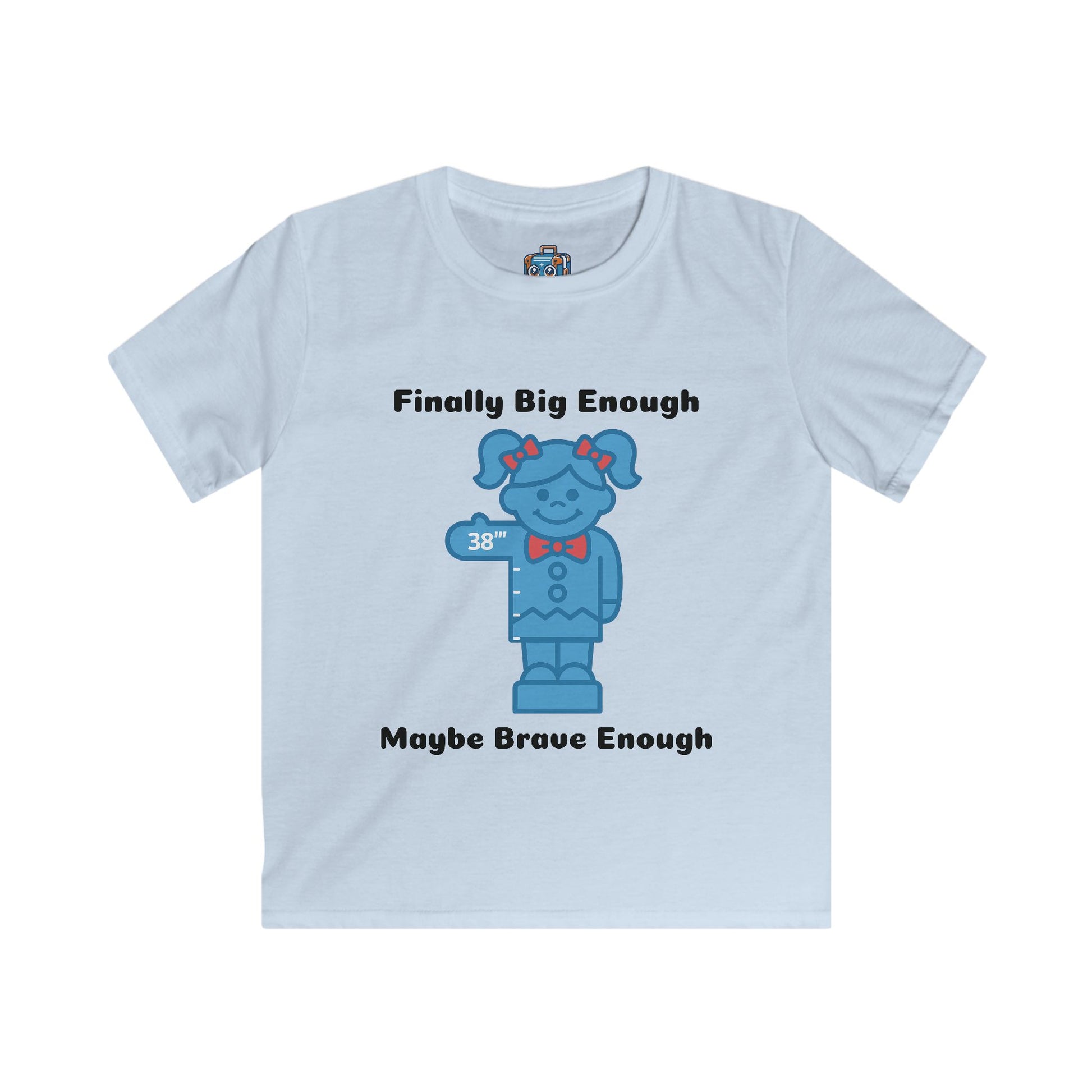Soft, light, and ready for play — this kids tee pairs gentle comfort with a little bit of brave-hearted fun. The front illustration shows a sweet, blue cartoon character holding up a number one, framed by the text “Finally Big Enough” above and “Maybe Brave Enough” below. That mix of pride and shy courage makes this shirt feel like a quiet celebration of small milestones: first day of preschool, losing a tooth, or wearing a big-kid outfit for the first time. The fabric is smooth and breathable, with a ribbed collar and taped shoulders that keep the tee shaped through washes and tumbles. It’s designed to move with active kids and wash away messes, while the tear-away label keeps little necks happy. Thoughtful details and a playful message let this tee sit easily in a kid’s everyday wardrobe — a soft layer for backyard adventures, family photos, or those tender moments when they’re practicing being brave.